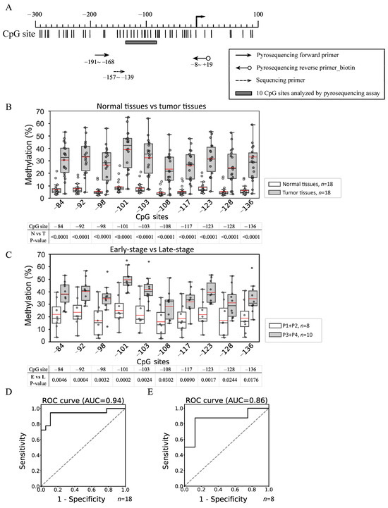 Pyrosequencing analysis of the methylation status in the promoter regions of miR-124-3. (A) The region from −191 to +19 was amplified using PCRs, and the area between −80 and −138, which covers 10 CpG sites, was sequenced using a pyrosequencing primer. The distribution of CpG sites is indicated by vertical bars. (B) The methylation status of miR-124-3 was analyzed in 18 paired OSCC and adjacent normal tissue samples. In each box plot, the whiskers represent the 10th and 90th percentiles, the box indicates the median with the 25th and 75th percentiles, and the red line is the mean. (C) Methylation levels were further compared between early-stage and late-stage tumor tissues. (D) The ROC curve obtained using miR-124-3 methylation to detect all-stage OSCC showed an AUC of 0.94. (E) The ROC curve obtained using miR-124-3 methylation to detect early-stage (P1 + P2) OSCC showed an AUC of 0.86. N vs. T, normal tissue vs. tumor tissue. E vs. L, early-stage tumor tissue vs. late-stage tumor tissue.