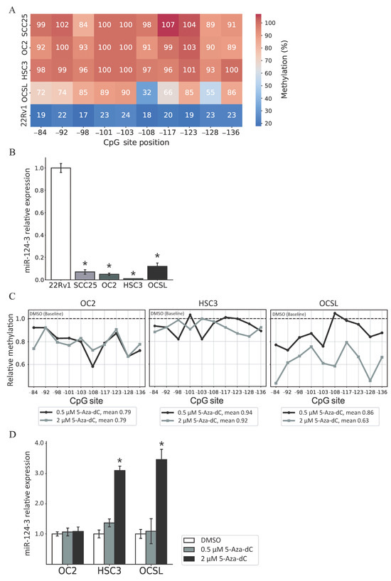 miRNAs are small noncoding RNAs involved in RNA silencing and the posttranscriptional regulation of gene expression [15]. In cancer research, miRNAs are considered crucial signaling components in tumorigenesis and appear increasingly promising as disease diagnostic biomarkers [16,17]. Although various miRNAs can function as oncogenes or tumor suppressors in different tumor types, there is substantial evidence that miR-124 acts as a tumor suppressor in several types of cancer, including HNSCC, glioblastoma, gastric cancer, hepatocellular carcinoma, colorectal cancer, and lung cancer. miR-124 is involved in inhibiting the proliferation, migration, and invasion of tumor cells, and even enhancing their chemosensitivity [18,19,20,21,22,23,24]. In OSCC, miR-124 has been shown to suppress cell motility by downregulating the expression of integrin beta-1, a membrane receptor involved in cell adhesion, which reduces the adherence and motility OSCC cells [25]. In addition to its role in regulating OSCC cell motility, miR-124 downregulation has also been observed in an animal model of carcinogen-induced oral cancer, further underscoring its potential involvement in oral carcinogenesis [26]. However, its altered methylation status and functional implications in OSCC have not been fully investigated.