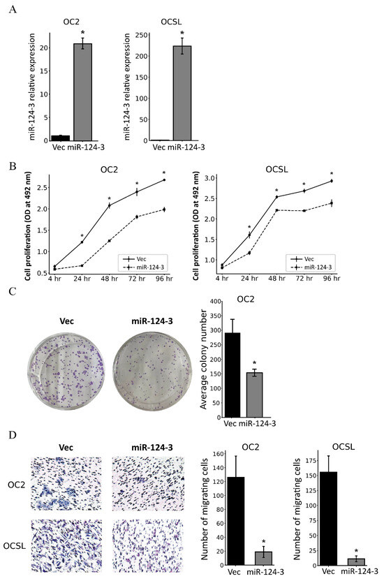 Restored miR-124-3 expression suppressed the proliferation, colony formation, and migration of OSCC cells. (A) Graph showing the results of quantitative RT–PCR analyses of miR-124-3 RNA levels in cells transfected with pSilencer 4.1-CMV vector or pSilencer_miR-124-3, with pSilencer 4.1-CMV vector-transfected cells set to 1. (B) The effect of miR-124-3 on the proliferation of OSCC cells was assessed using the MTS assay. OD values of cells were read using the Revelation 96-well microplate reader at 492 nm. (C) The cell colony formation assay showed that OC2 cells transfected with pSilencer_miR-124-3 formed fewer and smaller colonies. (D) The effect of miR-124-3 on OSCC cell migration was evaluated using the transwell migration assay. Data are mean and standard deviation values. * p < 0.05. Vec, pSilencer 4.1-CMV vector; miR-124-3, pSilencer_miR-124-3.
