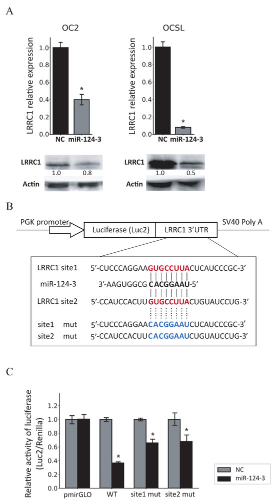 3.4. MiR-124-3 Downregulates LRRC1 Expression by Targeting Its 3′UTR