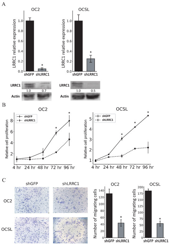 Knockdown of LRRC1 expression significantly reduced the proliferation and migration of OSCC cells. (A) Graph showing the results of quantitative RT–PCR analyses performed to assess LRRC1 expression levels in OSCC cells transduced with lentiviral vector carrying shLRRC1 or shGFP. The expression level of each shGFP-transduced cell was assigned a value of 1. Western blot findings of LRRC1 expression in cells transduced with lentiviral vector carrying shLRRC1 or shGFP, with β-actin used as a loading control. Quantification was performed by normalizing LRRC1 to β-actin and expressing it relative to the shGFP group. (B) The effect of LRRC1 knockdown on the proliferation of OSCC cells was assessed using the MTS assay. The increases in cell numbers were normalized to the number of cells at 4 h after cell seeding. (C) The effect of LRRC1 knockdown on OSCC cell migration was evaluated using the transwell migration assay. Data are mean and standard deviation values. * p < 0.05. shLRRC1, shLRRC1-expressing lentiviral vector; shGFP, shGFP-expressing lentiviral vector.