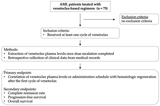 The primary endpoint of the study was the correlation between venetoclax plasma levels or administration schedule (≤14 vs. >14 days) with hematologic recovery after the first treatment cycle. The secondary endpoints included the following outcomes: complete remission (CR) rate, progression-free survival (PFS), and overall survival (OS). Risk stratification was performed according to the European Leukemia Network (ELN) 2022 guidelines [1]. For the purpose of this study, we included patients in CR with incomplete hematological regeneration within the CR group. Clinical data on patient baseline characteristics at first diagnosis, tumor responses, dates of progression and death, hematologic adverse events, as well as subsequent treatment lines were extracted from the clinical records. Study workflow and methods are summarized in Figure 1.