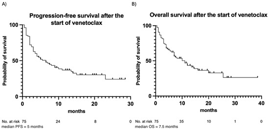 GraphPad Prism version 10 was used for statistical analyses and the graphical representations of the data. PFS was defined as the time from the first dose of venetoclax to the occurrence of progression, loss of follow-up, or death. OS was defined as the time from the start of venetoclax therapy to the date of death. Both PFS and OS curves were generated using the Kaplan–Meier method, with statistical significance assessed using the Mantel–Cox test and the Gehan–Breslow–Wilcoxon test. Categorical data were analyzed using Fisher’s exact test, and parametric data were evaluated using the unpaired t-test. Multiple regression analysis was conducted to explore statistical correlations between several independent variables and a single dependent variable. The following variables were included in the analyses: sex, age, European LeukemiaNet (ELN) risk stratification, French–American–British (FAB) classification, AML cytogenetics, selected molecular alterations, peripheral blood counts, and parameters related to venetoclax treatment (number and duration of cycles, dose, combination with HMA or LDAC, dose reductions, and selected co-medications), tumor responses, as well as time to progression and death. p-values were rounded to two decimals, and values below 0.05 were considered statistically significant. Percentage results were rounded to whole numbers.