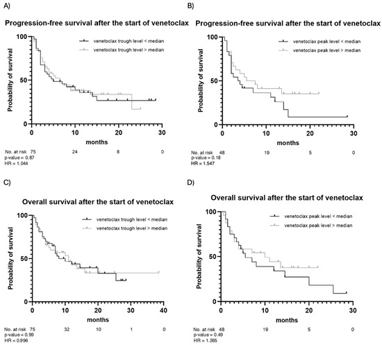 Progression-free survival and overall survival after the start of venetoclax stratified by venetoclax trough (A,C) and peak (B,D) levels. Observation time (months) is plotted in the X-axis, and the probability of survival, calculated using Kaplan–Meier analysis, is plotted in the Y-axis.