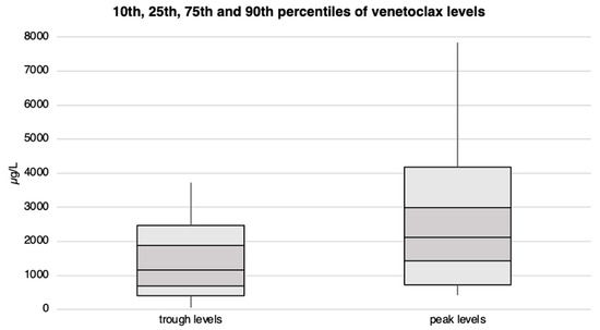 Venetoclax trough and peak plasma levels with corresponding percentiles for the entire patient cohort. The concentration levels (in µg/L) are plotted on the Y-axis, while the X-axis is divided into trough and peak levels.