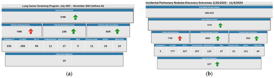 Memorial Cancer Institute Incidental Pulmonary Nodule Program. (a) On the left, the figure depicts the data from our traditional lung cancer screening program between July 2021 and July 2024 prior to the use of our combined IPN and AI model. (b) On the right, the figure depicts the data from our combined IPN and AI model between 26 February 2023 and 4 November 2024. There is a marked increase in lung cancer detection in the IPN and AI model from 10 to 107 diagnoses after only approximately 20 months of implementation.