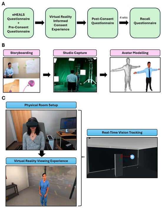 Figure 1C). The virtual reality content was provided by Microsoft and developed and produced at Microsoft Mixed Reality Capture Studios (San Francisco, CA, USA). The production involved the filming of two of the clinical investigators, who played the roles of patient and clinician. The avatars of the actors were created in the VR environment via spatial programming [