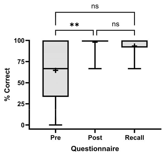 To assess knowledge retention and the effectiveness of the intervention, a three-question questionnaire was administered pre-intervention, immediately post-intervention, and 4 weeks post-intervention. The mean percentage of correct answers for each questionnaire timepoint were compared using a Restricted Maximum Likelihood (REML) mixed-effects model with Tukey’s multiple comparisons post hoc test. This model is particularly suitable for analyzing data with repeated measures, such as in this study where the same individuals were assessed at multiple timepoints. All statistical analyses were performed using GraphPad Prism software version 10.4.0 (San Diego, CA, USA).