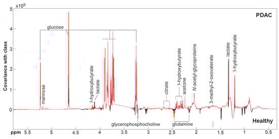 OPLS-DA model comparing the circulating metabolic profiles from participants with pancreatic ductal adenocarcinoma (PDAC) vs. healthy volunteers measured by 1H NMR spectroscopy (Q2Y = 0.30, p = 0.001). The coefficients plot indicates covariance with class, with positive peaks having a greater abundance in PDAC plasma compared to healthy volunteers and negative peaks being present in lower amounts. Red spectral peaks indicate metabolites significantly associated with class membership. PEG, polyethylene-glycol.