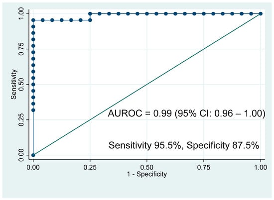 To determine if a combined panel of these significant metabolites could discriminate between PDAC and HV, logistic regression was performed using the concentrations of these metabolites. Postestimation analysis was then conducted using the predict var command to produce a one-step-ahead forecast using the estimated coefficient within the endogenous variable []. The resultant single variable was used to generate an ROC curve based on this estimation (Figure 2). The AUROC was 0.99 (95% CI: 0.96–1.00), with an estimated sensitivity and specificity of 95.5% and 87.5%, respectively.