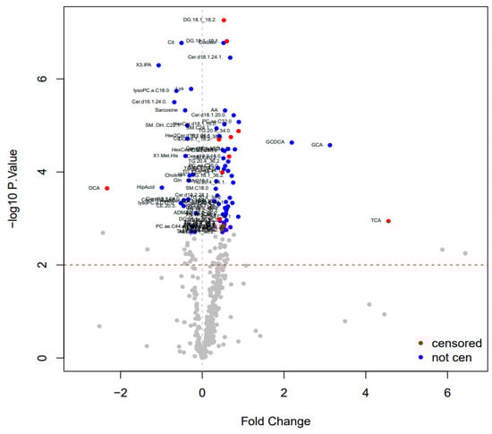 The initial data were processed for metabolites using a natural logarithm for the x axis to measure magnitude of log fold change (FC) (Figure 3). A FC of >±1.5 considered particularly important [], and those relevant metabolites are displayed in Table 3. Conjugated bile acids have a FC > 1.5 in the plasma of those with PDAC, i.e., taurocholic acid, glycocholic acid, and glycochenodeoxycholic acid. In contrast to this, the unconjugated bile acid deoxycholic acid was significantly elevated in the plasma of HV compared to PDAC.
