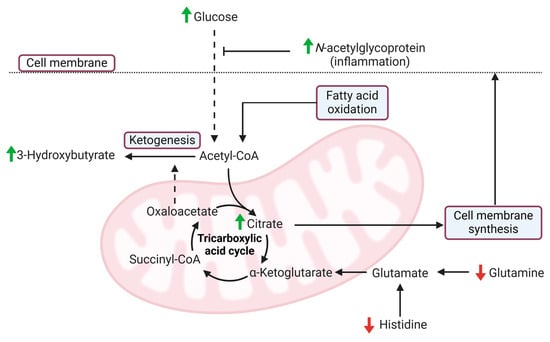 To offset the reduced amount of intracellular glucose available, alternative fuel sources are required to maintain cell function. NMR analysis was able to detect evidence of complementary pathways including ketogenesis, in particular the ketone body 3-HB. A compensatory increase in fatty acid oxidation produces an abundance of acetyl-CoA, which is converted to ketone bodies if oxaloacetate levels are depleted, e.g., by gluconeogenesis [,]. Each participant was requested to not consume anything other than water for 12 h preceding the test, so this was not a manifestation of fasting. As anticipated, glutaminolysis was also apparent due to decreased amount plasma glutamine as it is converted into glutamate prior to being utilized by PDAC cells [,]. This is one of the many KRAS-driven hallmarks of PDAC employed to circumvent lack of available nutrients []. Another is the use of cytosolic citrate in the formation of phospholipids, following its transportation out of the mitochondria and cleaved by ATP-citrate lysase into acetyl-CoA to produce cholesterol and fatty acids for cell membrane synthesis []. This would also increase oxaloacetate usage and result in further ketogenesis [].