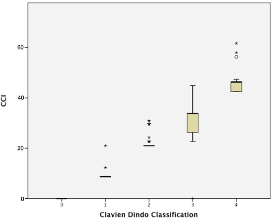 Distribution of CCI scores stratified by the highest Clavien–Dindo complication.