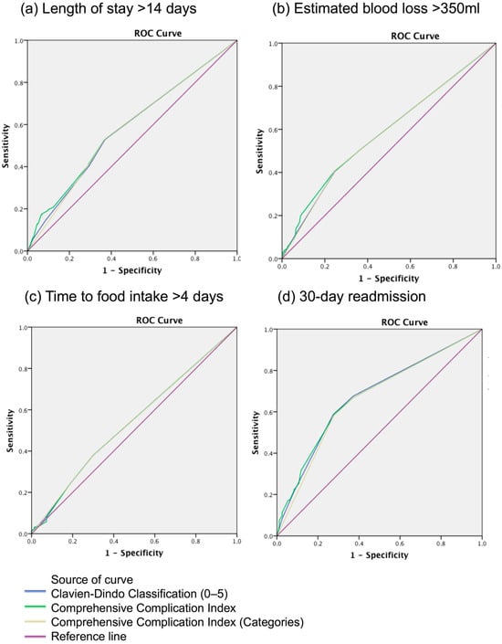 Receiver operating curves for Clavien–Dindo classification and comprehensive complication index for various peri-operative outcomes.