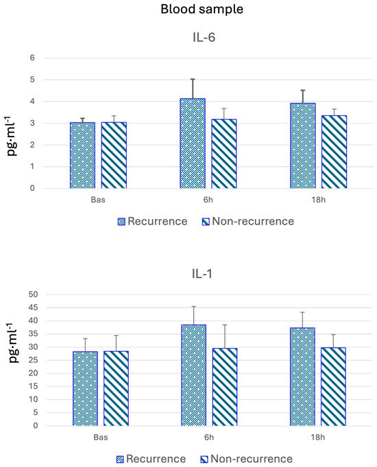 Baseline cytokine levels were compared between the recurrence and non-recurrence groups, as shown in Table 2 and Figure 1. Following surgery, all pro-inflammatory cytokine levels increased at 6 h, followed by a decline at 18 h. In the recurrence group, pro-inflammatory cytokine expression at both 6 and 18 h was higher compared to the non-recurrence group. Some cytokines exhibited significantly elevated levels in patients with recurrence. In contrast, IL-4 and IL-10 levels showed no significant differences at any timepoint or between the groups. Additionally, a greater increase in metalloproteinases was observed in the non-recurrence group.