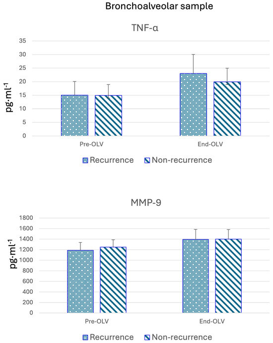 In the samples obtained at the beginning of surgery, before initiating one-lung ventilation (Table 3 and Figure 2), cytokine expression was similar between the recurrence and non-recurrence groups. However, after surgery, cytokine levels were generally higher in patients who experienced recurrence, except for IL-1 and MMP-9, which were elevated in the non-recurrence group. In contrast, IL-12 levels remained unchanged in both groups.