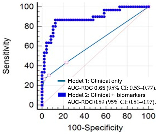 Comparison of ROC curves for logistic regression models 1 and 2. Model 1: clinical variables only. Model 2: clinical variables and inflammatory markers.