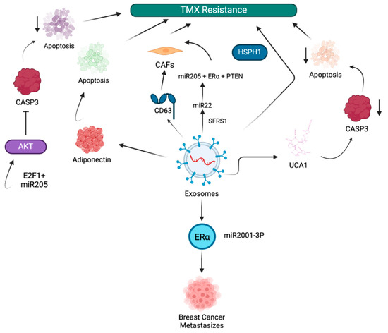 - Gao, Y.; Li, X.; Zeng, C.; Liu, C.; Hao, Q.; Li, W.; Zhang, K.; Zhang, W.; Wang, S.; Zhao, H.; et al. CD63(+) Cancer-Associated Fibroblasts Confer Tamoxifen Resistance to Breast Cancer Cells through Exosomal miR-22. Adv. Sci. 2020, 7, 2002518. [Google Scholar] [CrossRef]