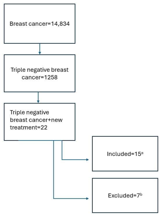 In triple-negative breast cancer (TNBC), there is no expression of estrogen (ER), progesterone (PR), and HER2 receptors. TNBC is considered an aggressive subtype; it is estimated that 5-year survival varies from 4% to 20% []. There is currently no standard targeted therapy for this subtype. Standard treatments include surgery and prior neoadjuvant and adjuvant chemotherapy [].