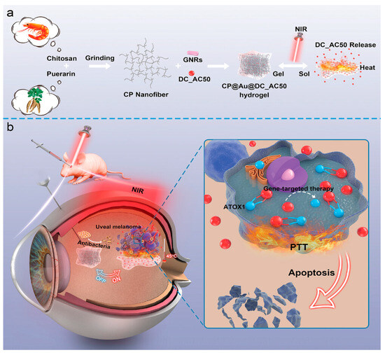 - Wang, S.; Chen, B.; Ouyang, L.; Wang, D.; Tan, J.; Qiao, Y.; Ge, S.; Ruan, J.; Zhuang, A.; Liu, X.; et al. A Novel Stimuli-Responsive Injectable Antibacterial Hydrogel to Achieve Synergetic Photothermal/Gene-Targeted Therapy towards Uveal Melanoma. Adv. Sci. 2021, 8, 2004721. [Google Scholar] [CrossRef]