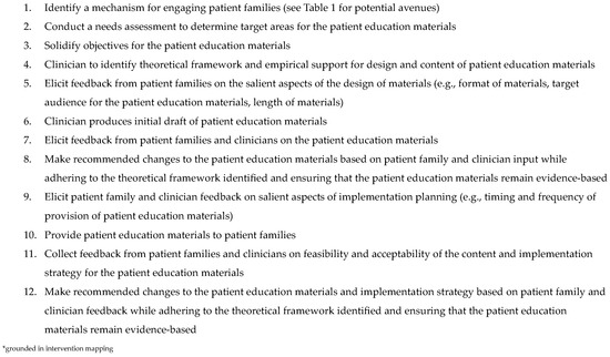 An important limitation to note is that this commentary does not represent original research or quality improvement methodology but seeks to encourage engagement with patient families in the creation of patient education materials, with recommended steps provided based on the extant literature [24] and tangible examples of how this has been accomplished at our institution. Strict adherence to intervention mapping was not utilized in the development of patient education materials at our institution, and we recognize that this is a limitation in drawing specific and robust conclusions from the examples provided. As such, the conclusions presented are based on the extant literature. Ongoing assessment of patient education materials at our institution presented as examples in this commentary is needed to empirically examine the acceptability and effectiveness of these interventions. Further, examples provided are based on the experience of one institution, which may limit generalizability. For those interested in engaging families in the development of patient education materials, Figure 1 provides a recommended process grounded in intervention mapping.
