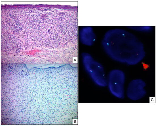 A clinically atypical, pigmented lesion from the left upper back of a 66-year-old female patient that shows significant architectural atypia. The junctional component shows confluence of single cells flattening of rete ridges and the dermal melanocytes grow in the form of expansile nests with associated non-brisk lymphocytic host response. The melanocytes show pleomorphism and no signs of maturation with descent ((A), H&E 100×). The melanocytes show no immunoreactivity for PRAME immunohistochemistry ((B), PRAME immunostain 100×). Fluorescence in situ hybridization showed significant gains in 6p25 (red dots) in comparison to centromere 6 (blue dots) and was seen in 32% of the examined melanocytes; the red arrows highlight two cells with gains ((C) fluorescence in situ hybridization 6p25 probe; 1000×).