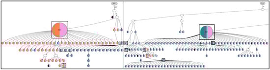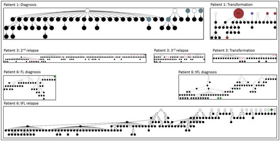 Relationship between N-gly-negative clones and their direct ancestral clone in FL patients. The negative subclones, parent clone and progenitor clone are shown in the figure. Black nodes represent N-gly-negative clones, white nodes represent undetected clones, and other node colors in the different patients represent N-gly-positive clones. Adapted from Odabashian et al. [].