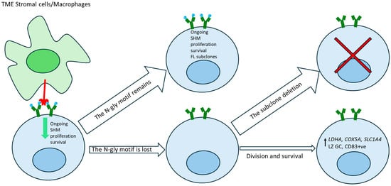 FL demonstrates extensive clonal evolution driven by TME interactions in combination with genetic and epigenetic alterations. To date, longitudinal studies of clonal evolution in FL have shed light on the role of the conserved N-gly motifs in FL subclones, which are required for progression and proliferation, at least until transformation into more aggressive DLBCL []. In FL, these motifs occur early in disease development and are positively selected during FL evolution. They are evidently essential for pathogenesis, enabling FL BCR activation through mannose/lectin interactions.