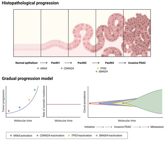 The gradual progression model posits that histopathological lesions are driven by the stepwise accumulation of specific known mutations [21]. As mentioned before, the main driver genes of PanINs and PDAC include KRAS, TP53, CDKN2A, and SMAD4 [14,21,40]. KRAS mutations are present in low-grade PanIN, indicating that it is the earliest alteration that drives ADM [41,42]. More importantly, they are also detected in healthy pancreatic tissue, thus confirming its role as the initiating oncogenic event [35]. Mutations in the tumor suppressor CDKN2A, are also often found early in the tumorigenesis process [43]. Further accumulation of inactivating mutations in the tumor suppressor genes TP53 and SMAD4, leads to progression to PDAC (Figure 1) [44,45,46]. The accumulation of genetic and morphological alterations is proposed to occur during one to two decades until invasive carcinoma is developed [44]. However, although it appears to be a gradual process, not all mutations are present in all patients. The inactivation of different tumor suppressors, their type of alteration, and the combination of both, results in wide tumoral heterogeneity. These evolutionary trajectories give rise to a large number of inter- and intra-tumoral differences that define tumor behavior [44,47,48].