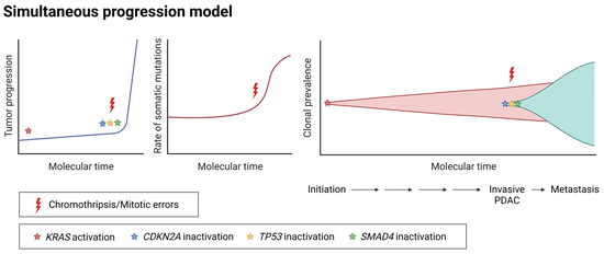 Two models of tumor evolution have been proposed for the genomic events that occur during PDAC evolution. According to the classical or gradual progression model, precursor lesions accumulate genetic alterations over many years and eventually lead to malignancy [20,21,22]. Alternatively, the more recent model of simultaneous progression proposes that PDAC driver gene activations and inactivations can occur concomitantly through complex chromosomal rearrangements, leading to rapid tumor development and dissemination [23,24].