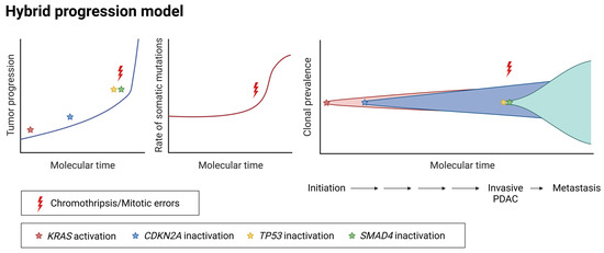 Schematic representation of a hybrid model of PDAC evolution, which combines features of the gradual and simultaneous progression process. Tumor progression, accumulation rate of somatic mutations, and clonal prevalence over molecular time, are represented. Adapted from [47].