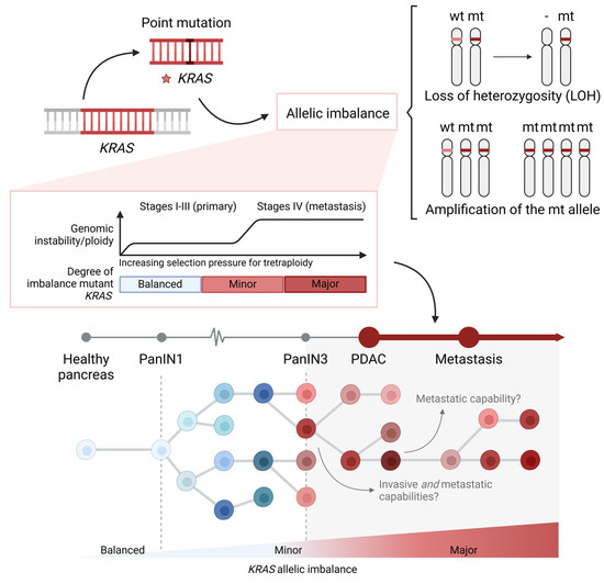 As the increased allelic frequency of mutant KRAS is also detected in low-grade PanINs and KRAS amplification takes place early in tumorigenesis, it seems that increased mutant KRAS dosage provides a clonal advantage (Figure 4) [52]. However, further changes in KRAS allelic states in PDAC during the evolution of tumors might follow distinct routes that are accompanied by the inactivation of tumor suppressors [70]. It is estimated that the loss of CDKN2A precedes mutant KRAS amplification [51,52]. According to the interplay between macroevolution and punctuated events during PDAC progression, an initial preneoplastic diploid phase precedes genomic instability and copy number alterations. Thus, KRAS point mutations are then followed by large structural rearrangements that are responsible for losses of the wt KRAS allele and other key driver genes. Next, genome doubling is another key molecular event that amplifies existing KRAS gains, leading to major allelic imbalances [51]. These genomic events drive rapid tumor progression and metastasis (Figure 4). Indeed, major KRAS allelic imbalances are detected in a considerable fraction of advanced-stage tumors and hepatic metastases [51,52].