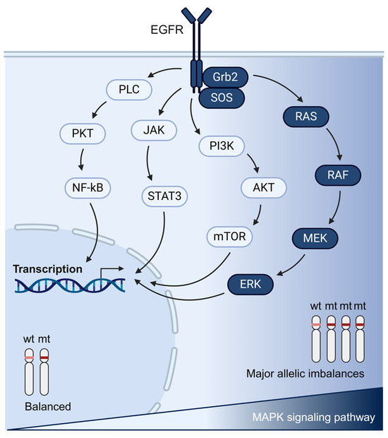 Graphical representation of the RAS signaling network. Increased MAPK signaling is represented in darker blue and is associated with major allelic imbalances and the increased dosage of oncogenic KRAS.