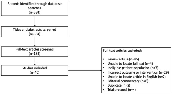 The initial and updated search resulted in 584 citations; 139 articles after stage I (title and abstract) review, and then 40 studies deemed eligible for data extraction after stage II (full text) review (Figure 1). Of these, 24 were full-text articles and 16 were abstracts. Twelve studies included human subjects only, sixteen utilized mouse models only, seven included both, and five studies used machine learning from large datasets or next-generation sequencing on tumor samples. A total of 1462 patients were included in the human studies, of which 1010 (69.1%) had a brain cancer diagnosis, and 452 (30.9%) were healthy controls; one study, available as an abstract only, did not provide the sample size. In total, there were 737 patients (73.0%) with primary brain tumors and 273 (27.0%) with brain metastases.