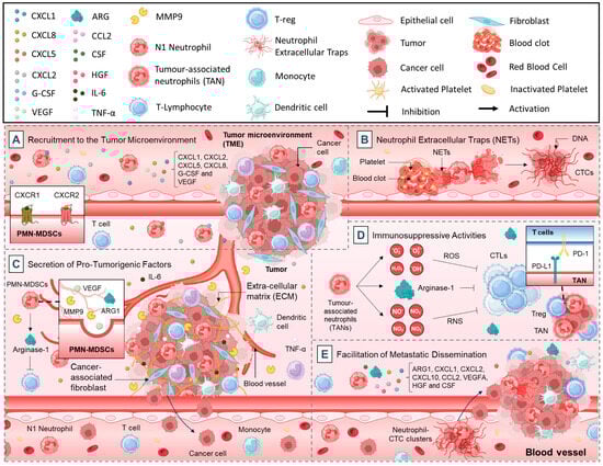 Pro-tumorigenic functions of neutrophils: (A). recruitment to the TME, (B). Neutrophil Extracellular Traps (NETs), (C). secretion of pro-tumorigenic factors, (D). immunosuppressive activities, (E). facilitation of metastatic dissemination.