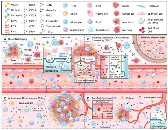 Anti-tumorigenic functions of neutrophils: (A). direct cytotoxicity, (B). Antibody-Dependent Cell-Mediated Cytotoxicity (ADCC), (C); activation of other immune cells, and (D). anti-angiogenic activity.