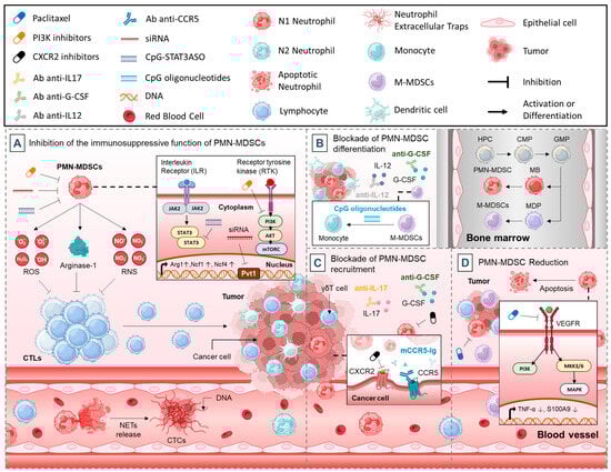 Therapeutic strategies and mechanisms of action, targeting PMN-MDSCs: (A). inhibition of the immunosuppressive function of PMN-MDSCs, (B). blockade of PMN-MDSCs differentiation, (C). blockade of PMN-MDSCs recruitment and (D). PMN-MDSCs reduction.