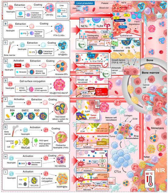 Neutrophils, as essential components of the immune system, have been exploited in recent years as vectors for targeted drug delivery in anti-cancer therapy [5]. Their ability to infiltrate tumors and interact with various immune and stromal cells makes them promising candidates for advanced drug delivery strategies [5]. This section highlights different neutrophil-based platforms, their therapeutic effects, and the common biological mechanisms they engage (Figure 4).