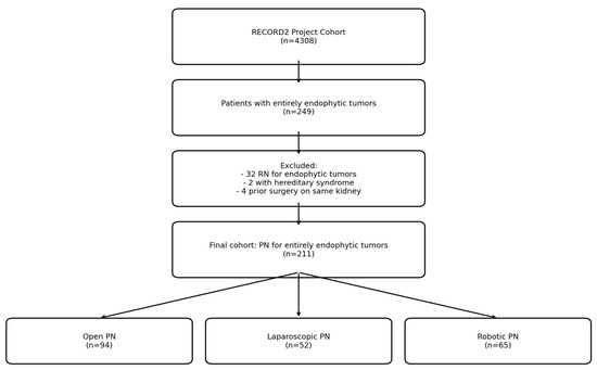 The Italian Registry of Conservative and Radical Surgery for cortical renal tumor Disease (RECORD 2 Project) is a prospective observational multicenter project promoted by the Italian Society of Urology (SIU) [16]. This study was approved by the local ethics committee, and informed consent was collected for all the patients. Overall, 4308 consecutive patients who had PN and RN for cortical renal tumors at 26 urological Italian centers between 1st January 2013 and 3rd December 2016 were included. The patient selection flowchart from the RECORD2 project is depicted in Figure 1.