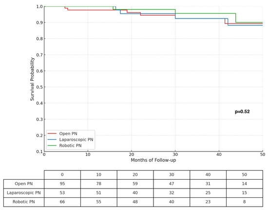 Table 3 shows postoperative outcomes. Clear cell RCC, papillary RCC, and chromophobe RCC were found in 63.5%, 10.4%, and 7.1% of cases, while a benign histology was present in 14.2% of cases. Overall, 137 (64.9%), 35 (16.6%), and 9 (4.3%) renal tumors were staged as pT1a, pT1b, and pT3a, respectively. Positive surgical margins (PSMs) were reported in 18 (8.5%) patients, with no differences among different surgical approaches. At a median follow up of 36.3 (IQR 21.9−49.2) months, recurrence free survival was 93.8%. Cancer-specific survival was 100%. No differences in terms of survival outcomes emerged when comparing the three approaches. Kaplan–Meier curves, depicting RFS for open, laparoscopic, and robotic approaches, are shown in Figure 3.