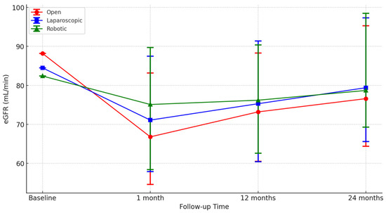 Median estimated glomerular filtration rate (eGFR) and interquartile ranges over time for each surgical approach—open, laparoscopic, and robotic PN.