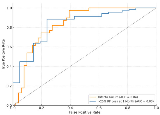 ROC curves from multivariable logistic regression models predicting two postoperative outcomes following partial nephrectomy for entirely endophytic renal tumors. The orange curve represents the model predicting Trifecta failure, while the blue curve represents the model predicting >25% renal function loss at 1 month. The area under the curve (AUC) reflects the model’s discriminative ability. Dashed diagonal line indicates reference (random) performance.
