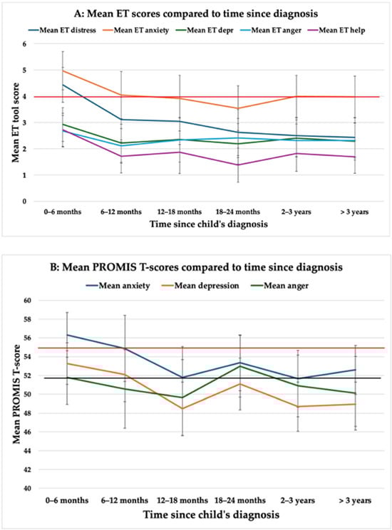 (A) Mean Emotion Thermometer (ET) scores compared to time since diagnosis. Red horizontal line indicates the clinical cut-off of ≥ 4. Error bars indicated 95% confidence interval. (B) Mean PROMIS T-scores compared to time since diagnosis. Red horizontal line indicates the clinical cut-off of 0.5 SD above the mean. Error bars indicate 95% confidence interval.