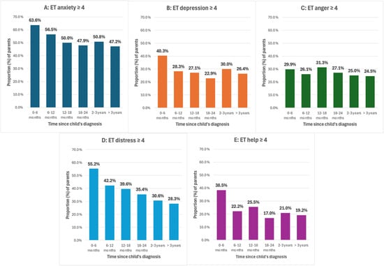 Proportions of parents reporting Emotion Thermometer (ET) scores above the clinical cut-off (≥ 4) across time since their child’s diagnosis. (A) ET anxiety, (B) ET depression, (C) ET anger, (D) ET distress and (E) ET need for help.