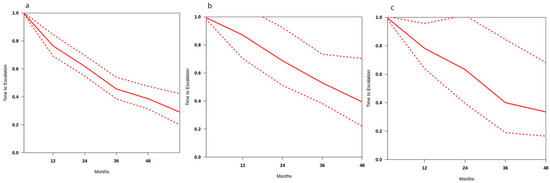 In hormone-naïve patients, in seven studies, the estimated 2 year treatment-escalation-free survival rate was 61.9% (CI: 54.9–69.6%), with pooled survival rates ranging from 76.5% at 1 year to 38.6% at 4 years. The median time to treatment escalation was 32.7 months. Low heterogeneity was identified (i2 = 17.9%). Figure 2a shows treatment-escalation-free survival curves extracted from studies and the summary curve for patients treated with MDT alone.