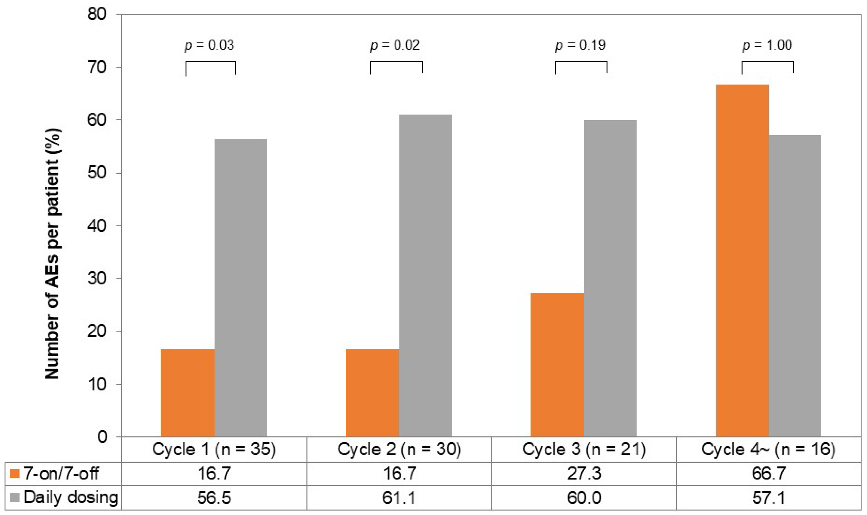 Figure 4. The incidence of AEs per chemotherapy cycle in the 7-on/7-off and daily dosing groups. One chemotherapy cycle was defined as 28 days of cabozantinib administration. The incidence of AEs in cycle one and cycle two was significantly lower in the 7-on/7-off group in comparison to the daily dosing group. AEs, adverse events.