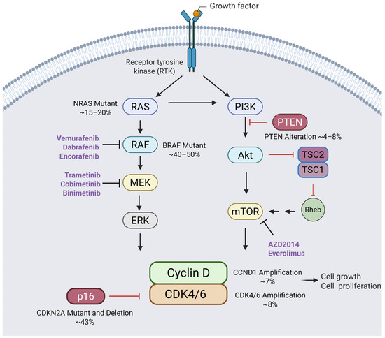 Cell cycle activation in melanoma via the RAS-RAF-MEK-ERK and PI3K-Akt-mTOR pathways. Cell cycle progression in melanoma is primarily driven by the RAS-RAF-MEK-ERK and PI3K-Akt-mTOR signaling pathways. These pathways regulate key Cyclin-dependent kinases (CDK4/6), promoting the transition from the G1 to S phase. The left-hand side depicts the RAS-RAF-MEK-ERK pathway. The activation of RAS leads to the phosphorylation and activation of RAF, MEK, and ERK, resulting in the upregulation of Cyclin D. Cyclin D binds to CDK4/6, triggering the phosphorylation of the retinoblastoma (RB) protein (depicted in Figure 2). The right-hand side depicts the PI3K-Akt-mTOR pathway and TSC2 regulation. The TSC1-TSC2 complex functions as a GTPase-activating protein (GAP), preventing Rheb from activating mTORC1. This suppresses protein synthesis and cell growth. Key tumor suppressors altered in melanoma, such as PTEN and p16, regulate these pathways. PTEN antagonizes PI3K-Akt signaling, while p16 inhibits Cyclin D–CDK4/6 activity, ensuring tight control over the cell cycle. Therapeutic inhibitors targeting these pathways are shown (highlighted in purple). This figure was generated using BioRender (https://www.biorender.com/).