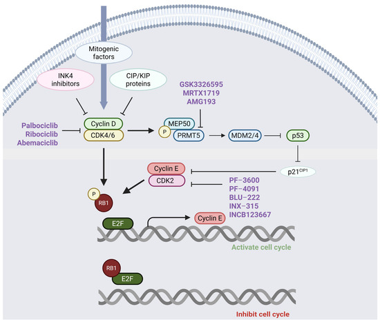 The Cyclin D–CDK4/6–RB–E2F pathway and its interaction with the MEP50/PRMT5-p53-p21-CDK2 axis. The activity of Cyclin D–CDK4/6 is controlled by INK4 inhibitors and CIP/KIP proteins, which regulate cell cycle progression. Cyclin D–CDK4/6 complexes phosphorylate RB, which releases E2F transcription factors, enhancing Cyclin E transcription. Cyclin E subsequently binds and activates CDK2, resulting in RB hyperphosphorylation and the transcription of genes that drive the cell division cycle. MEP50, a substrate of Cyclin D–CDK4/6 complexes, increases the activity of PRMT5, which can reduce the expression of p21 (a CIP/KIP family member) by enhancing the expression of MDM4, which normally inhibits the activity of p53. Reduced p21 expression leads to the diminished inhibition of CDK2, facilitating cell cycle progression. Several inhibitors are either developed or in development to target various components of this pathway, including CDK4/6, CDK2, and PRMT5 (highlighted in purple). This figure was generated using BioRender (https://www.biorender.com/).