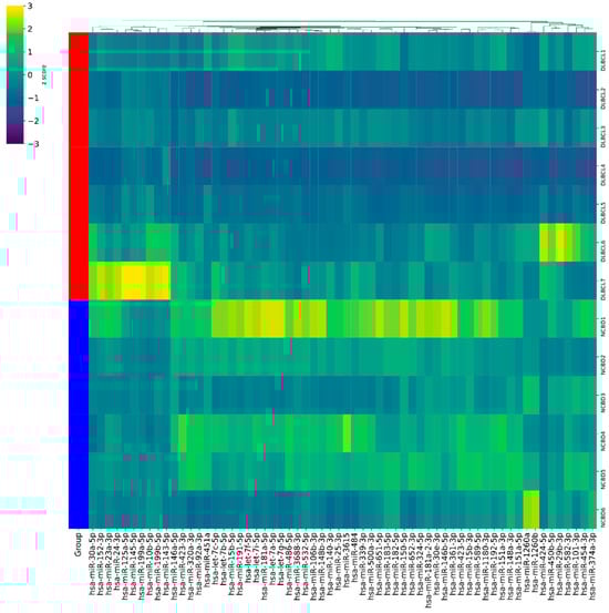 Hierarchical cluster analysis between 7 diffuse large B-cell lymphoma (DLBCL) cases and 6 cases of non-cancerous blood diseases (NCBDs) for miRNAs that were selected for validation using RT-PCR in the groups being investigated. Each column illustrates the expression of an miRNA, and each row means a nucleic acid specimen. Yellow: overexpressed miRNA; dark blue: downregulated miRNA; green: minor changes; red: a graphical representation of a group of samples.