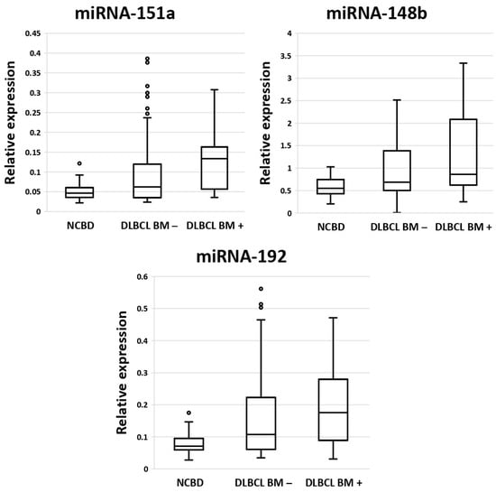 We observed a statistically significant increase in the expression of miRNA-151a, miRNA-148b, and miRNA-192 in bone marrow samples from DLBCL patients both with and without bone marrow involvement compared to bone marrow samples from patients with NCBD (p < 0.05).